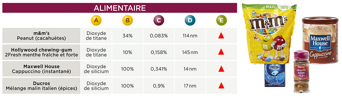 Les résultats sont clairs: les douze produits analysés contiennent des nanoparticules. Pour sept d’entre eux, la totalité de la substance examinée est nanométrique. Pour les cinq autres, la part de molécules nano varie entre 6 et 97%. Au rayon alimentation, les m&m’s et les chewing-gums Hollywood contiennent du dioxyde de titane comme colorant blanc sous forme nano. Tout comme dans le café en poudre Cappuccino de Maxwell, qui emploie du dioxyde de silicium pour ses propriétés anti-agglomérantes. Or, d’après nos analyses, cet additif est entièrement constitué de particules nano. Un résultat si flagrant que les aliments analysés devraient porter la mention [nano] sur l’emballage juste après le nom de l’ingrédient (colorant E 171 ou anti-agglomérant E 551). Or, cette mention ne figure dans aucune des compositions, ce qui est tout à fait regrettable.