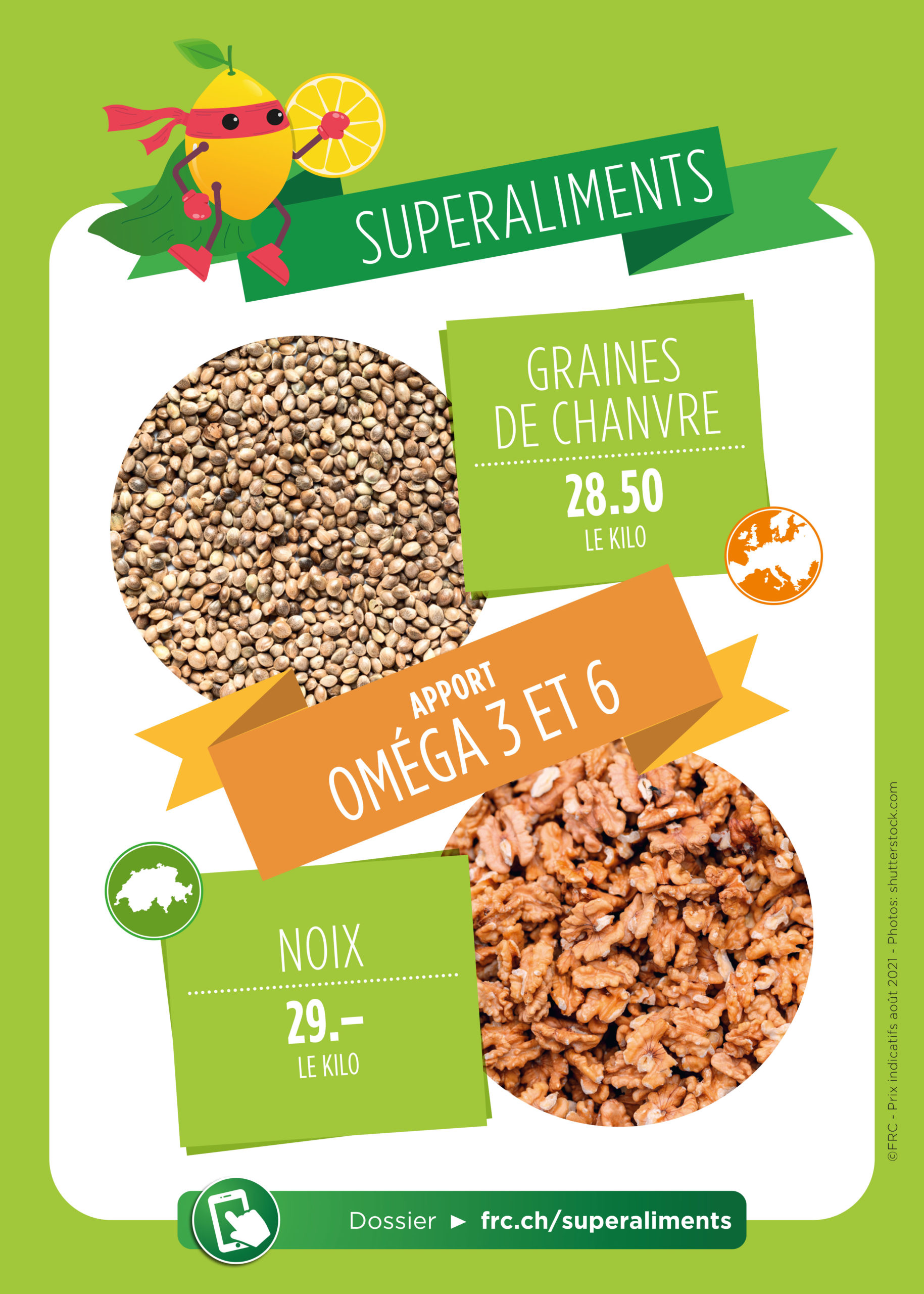 La culture du chanvre est millénaire, mais la mode des superaliments a mis cette plante au goût du jour. En graines nature ou torréfiées, sous forme d’huile, moulus en farine, les chènevis entrent dans la composition du pain, des mélanges pour bircher ou salade, agrémentent un yogourt. Riches en protéines, ils ont une teneur favorable en acides gras mono- et polyinsaturés. Deux familles d’oméga 3 et 6 s’y trouvent en bonne proportion – comme dans les noix et les graines de lin, des produits qui ont l’avantage d’être produits localement et avec soin contrairement aux graines de chanvre qui proviennent de Lituanie, Lettonie et Roumanie.