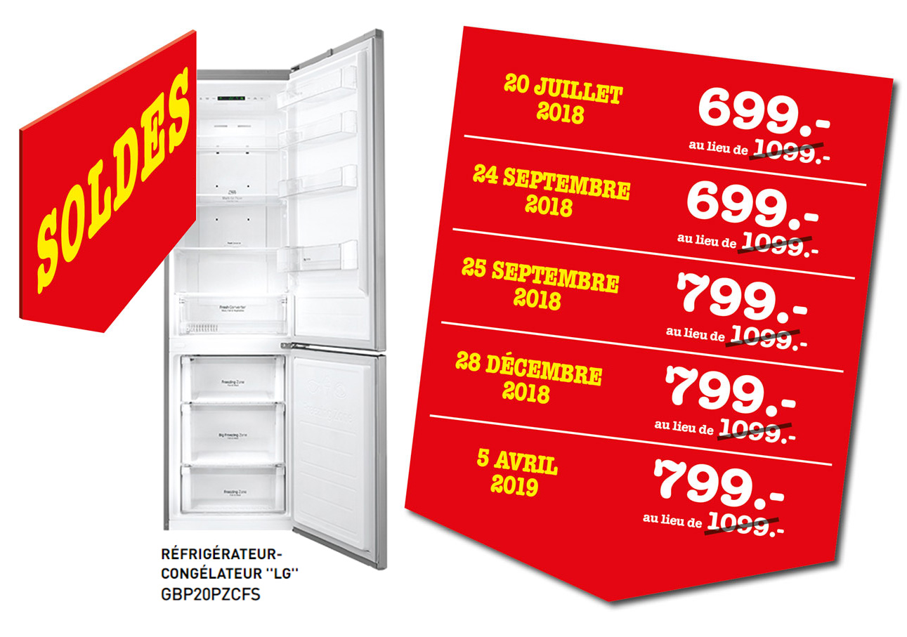 Ce frigo-congélateur de marque trouvé chez Conforama est sans doute un des cas les plus emblématique de notre enquête. En effet, sur 46 relevés, étalés sur plus dix mois, effectués aussi bien en magasin que sur le site internet, le produit n’a jamais été vendu à la valeur donnée comme comparaison. Ce qui serait contraire à l’OIP. Selon nos observations, le prix de vente s’est toujours situé entre 699 fr. et 799 fr., prix plus ou moins équivalent à celui pratiqué par la concurrence. Ce rabais alléchant pourrait induire le client en erreur.
