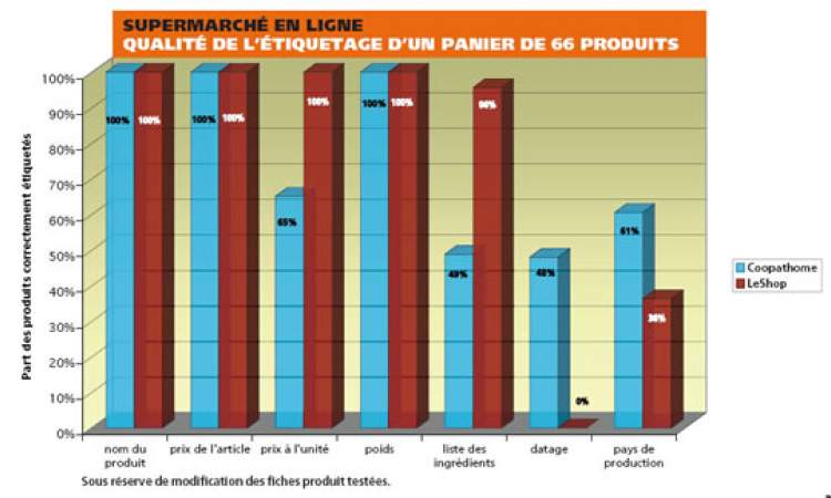 Celles qu'ils donnent avec la seule constance jamais prise en défaut, - sur les 66 produits analysés - concernent les indications de base: nom du produit, prix et poids. LeShop mentionne par ailleurs systématiquement le prix à l'unité, ce qui facilite les comparaisons de prix, alors que coop@home ne le fait que pour trois produits sur cinq. Voilà pour les bonnes nouvelles.